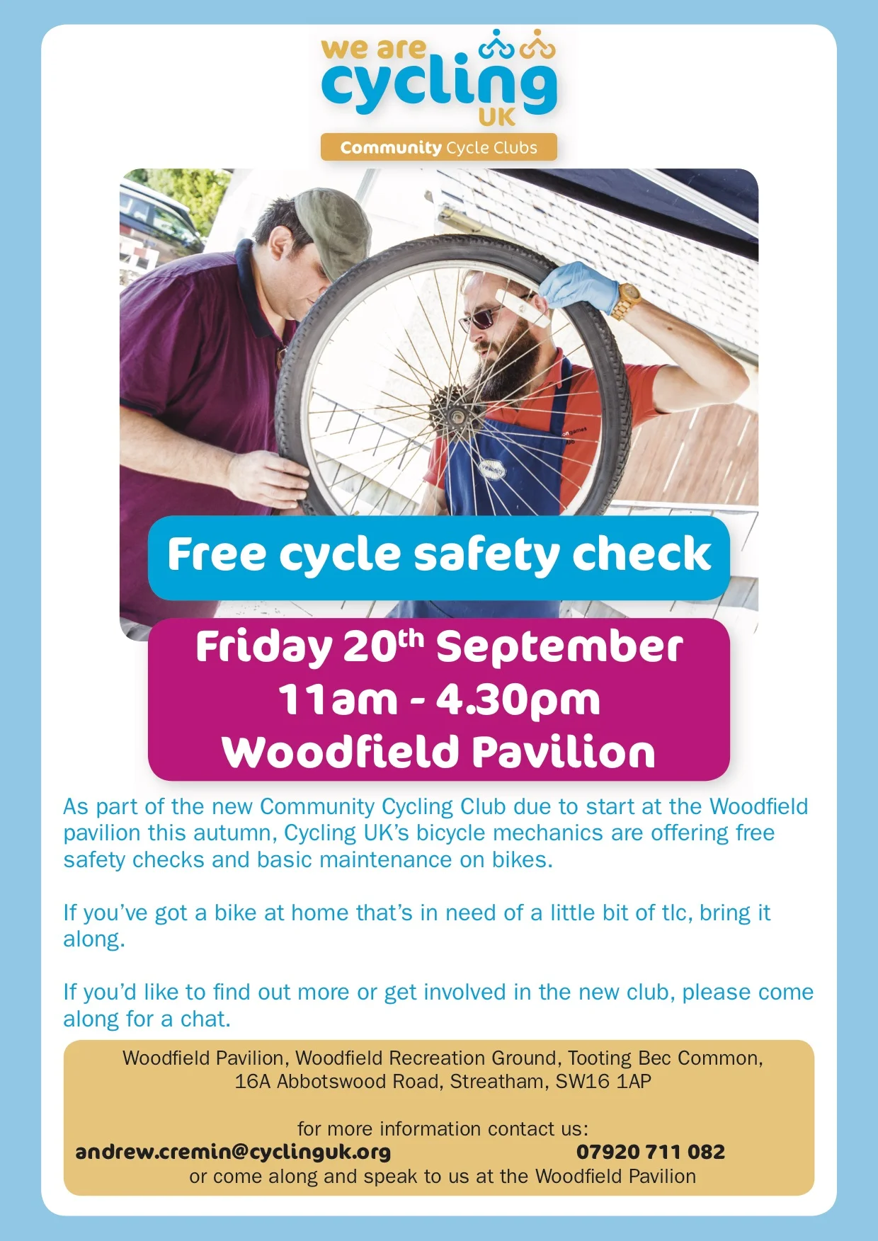 As part of the new Community Cycling Club due to start at the Woodfield pavilion this autumn, Cycling UK’s bicycle mechanics are offering free safety checks and basic maintenance on bikes.